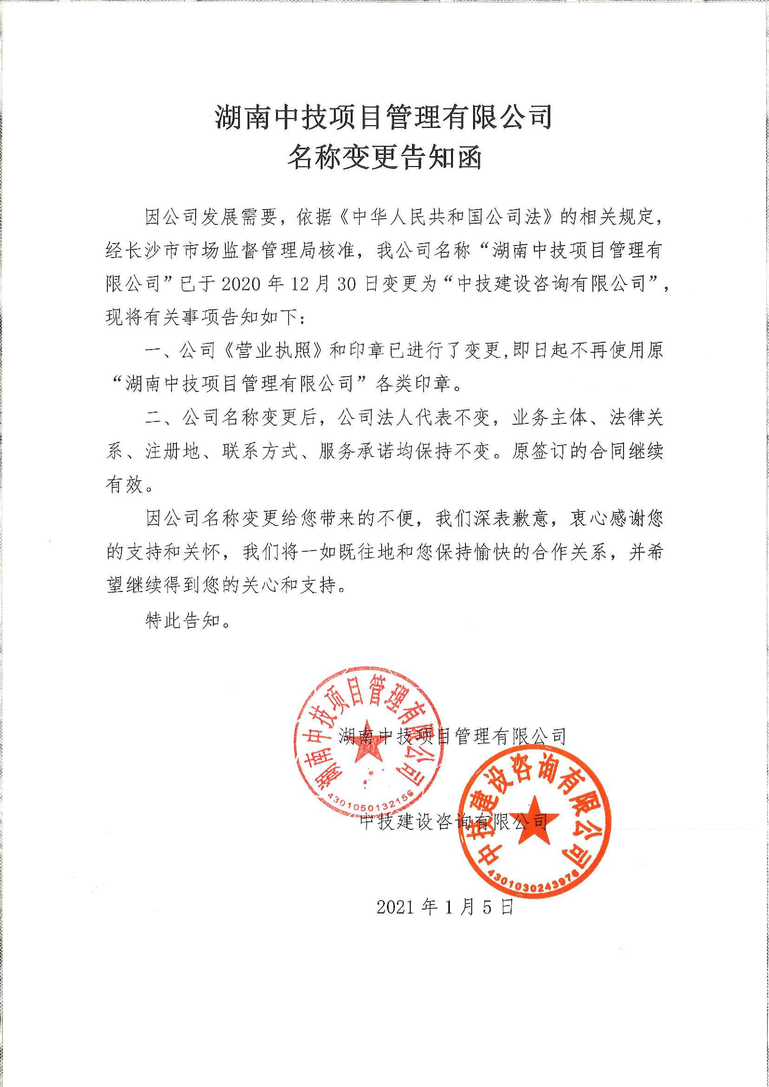 因公司发展需要,依据《中华人民共和国����� �������Ƴ������������ �������Ƴ������������ �������Ƴ������������ �������Ƴ�������公司法》的相关规定,经长沙市市场监督管理����� �������Ƴ������������ �������Ƴ������������ �������Ƴ������������ �������Ƴ�������局核准,我公司名称“湖南����� �������Ƴ������������ �������Ƴ������������ �������Ƴ������������ �������Ƴ�������中技项目管理有限公司”已于2020年12月30日变更为“中技建设咨询有����� �������Ƴ������������ �������Ƴ������������ �������Ƴ������������ �������Ƴ�������限公司”,现将有关事项告知如下: